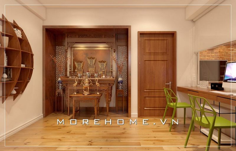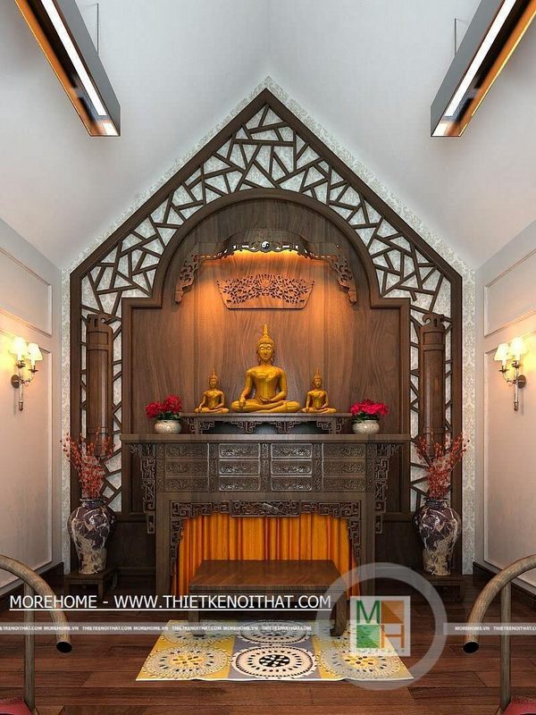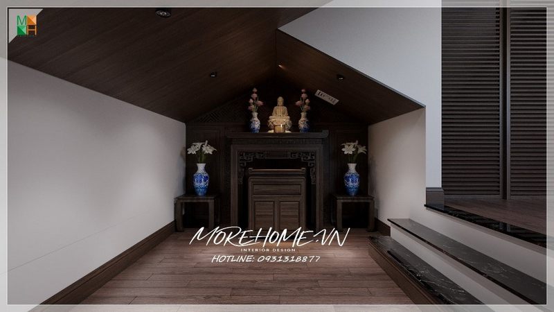 Thiết kế phòng thờ với nội thất gỗ tự nhiên, và cách trang trí ấn tượng, sang trọng tạo không khí tôn nghiêm, yên tĩnh
