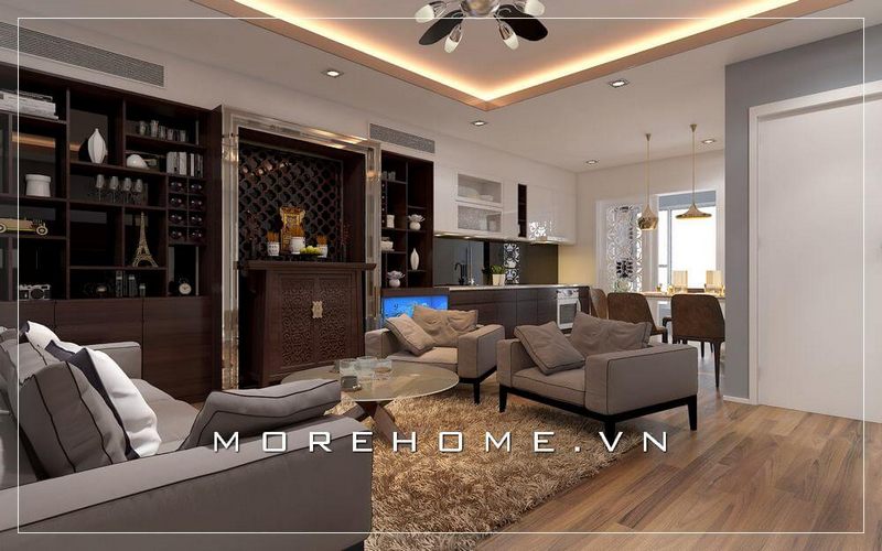 Mẫu bàn thờ cao cấp màu nâu trầm với bàn thờ con để mâm cơm, hoa quả mang đến vẻ đẹp sang trọng cho không gian căn phòng.