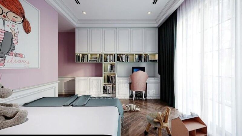 Bố trí nội thất phòng ngủ bé gái ấn tượng với bố trí giường ngủ, kệ tủ trang trí khoa học giúp không gian thông thoáng tối đa nhưng vẫn đảm bảo công năng, tính thẩm mỹ.