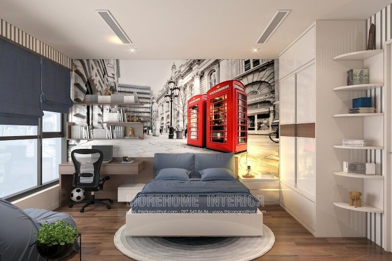 Mẫu giường ngủ đẹp màu trắng được bố trí chính giữa không gian tạo điểm nhấn ấn tượng cho phòng ngủ con trai