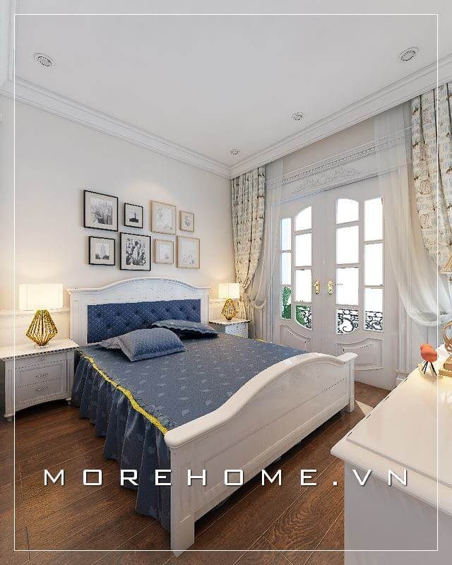 Thiết kế giường ngủ tân cổ điển với phần khung gỗ tần bì nhập khẩu phun sơn trắng Alkana cao cấp, đầu giường bọc nỉ mang lại một không gian sinh động đầy màu sắc