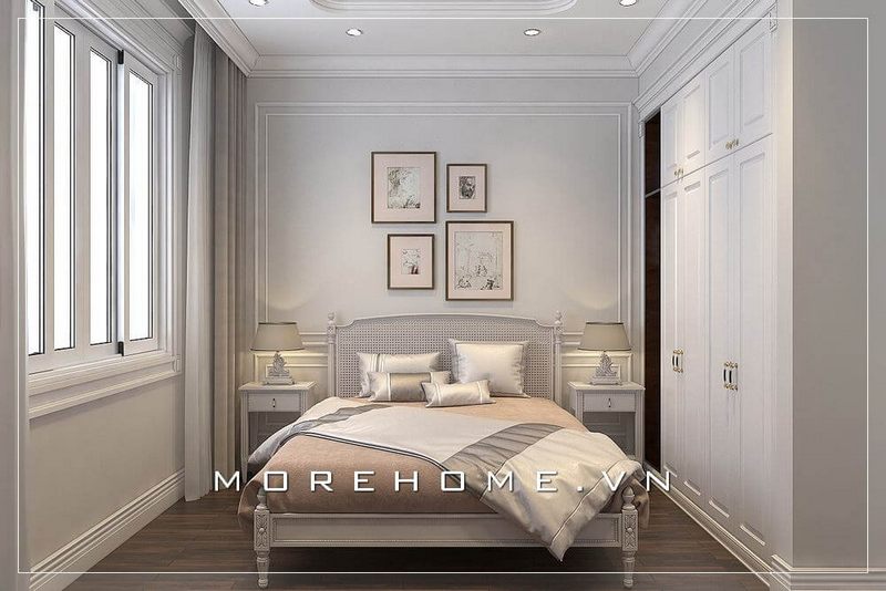 Thiết kế giường ngủ 2 người sang trọng, tinh tế với gam màu trắng chủ đạo