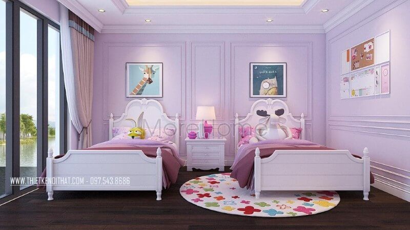 Mang phong cách tân cổ điển sang trọng, mẫu giường ngủ màu trắng chủ đạo kết hợp với màu hồng nhạt mang lại cảm giác dễ chịu, nhẹ nhàng cho khu vực phòng ngủ con