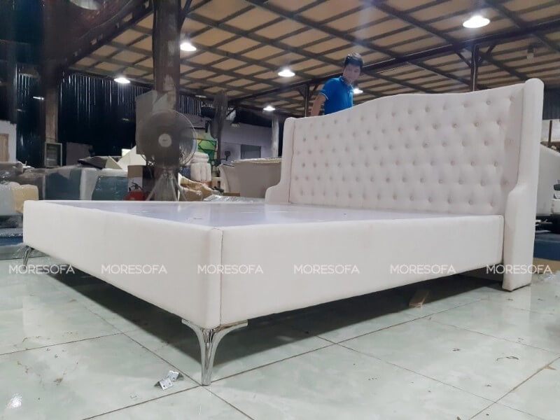 Mẫu giường ngủ gỗ sồi phun sơn trắng cao cấp, phần đầu giường kết hợp bọc nỉ nhung lạ mắt. Đây được coi là một trong những mẫu giường đẹp thuộc bộ sưu tập giường ngủ "hot"nhất hiện nay trên thị trường Việt
