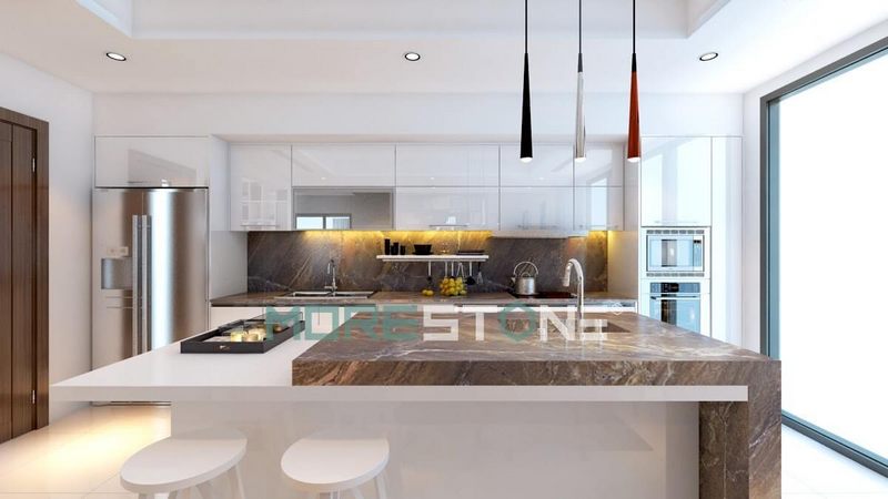 Xu hướng mới gia chủ sử dụng đồng bộ mặt bếp và tường bếp bằng ốp đá để tăng tính thẩm mỹ, hợp vệ sinh trong thi công bếp