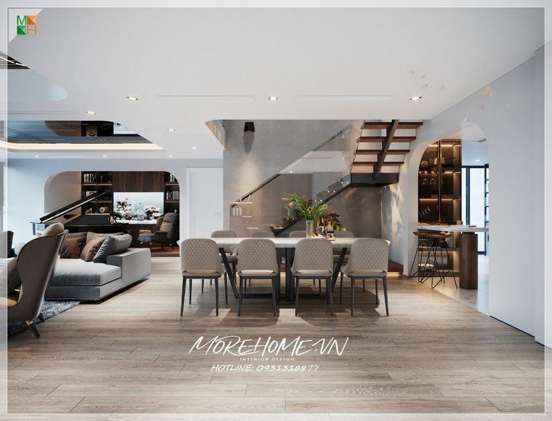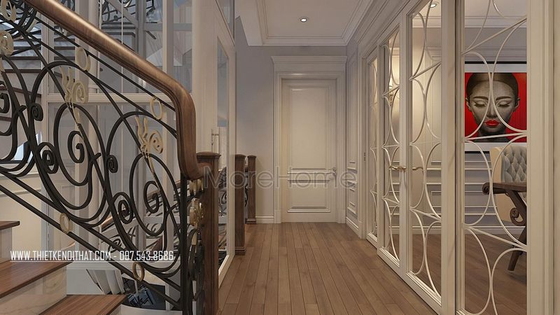 Bất kì ai cũng bị thu hút bởi các chi tiết nghệ thuật trong thiết kế cầu thang gỗ và sắt của MoreHome trong không gian biệt thự, nhà phố.