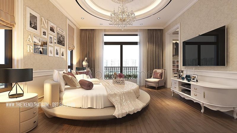 Một không gian phòng ngủ rộng rãi đầy đủ tiện nghi là điều nhiều người ao ước sở hữu nhờ vào điểm nhấn chiếc giường tân cổ điển với cách bố trí nội thất một khách khoa học và ngăn nắp.