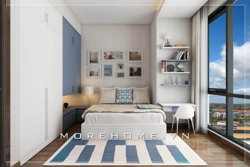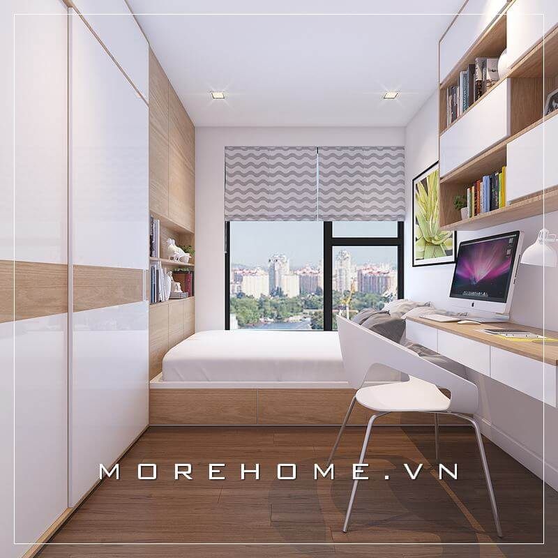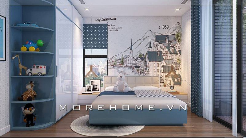Bố trí nội thất phòng ngủ chung cư hiện đại tại phòng ngủ của con hợp lí, tủ quần áo âm tường kịch trần tạo cho không gian thêm cao hơn