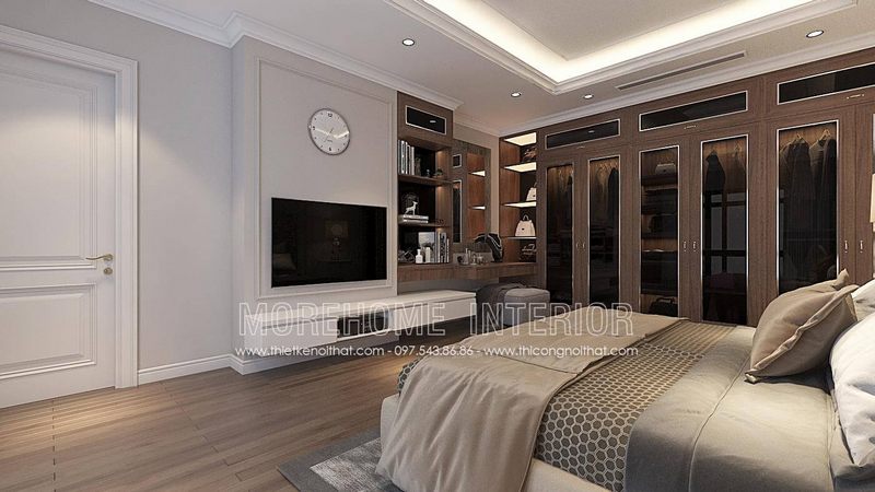Tủ áo gần giường Master được trang trí bằng kính cường lực tối màu và viền kim loại sáng, tạo nên cảm giác sang trọng cho phòng ngủ.