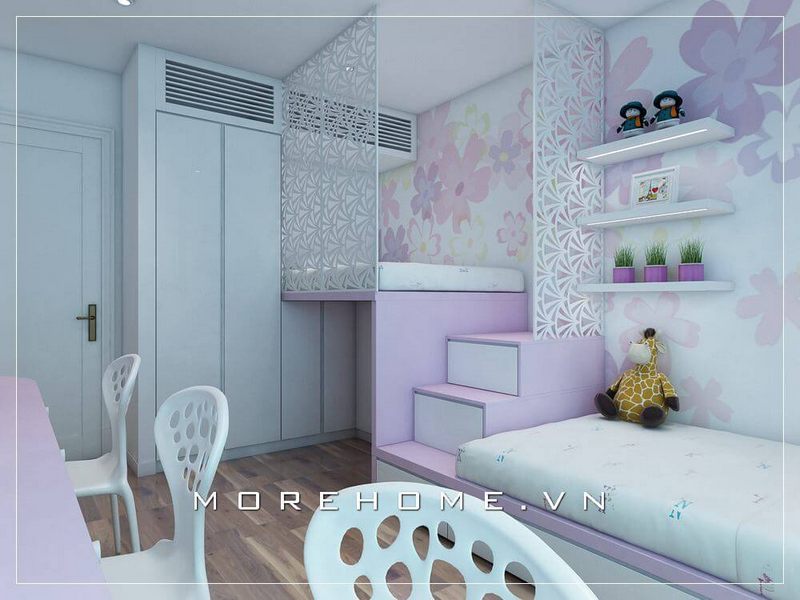 Mẫu tủ áo gỗ công nghiệp với gam màu trắng nhẹ nhàng và tinh tế để trang trí phòng ngủ của bé gái.