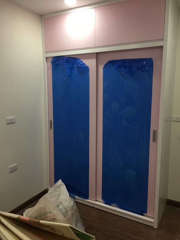 Tủ áo gỗ sơn màu hồng, phù hợp với các bé gái, được thi công trong dự án chung cư Eco Dream.